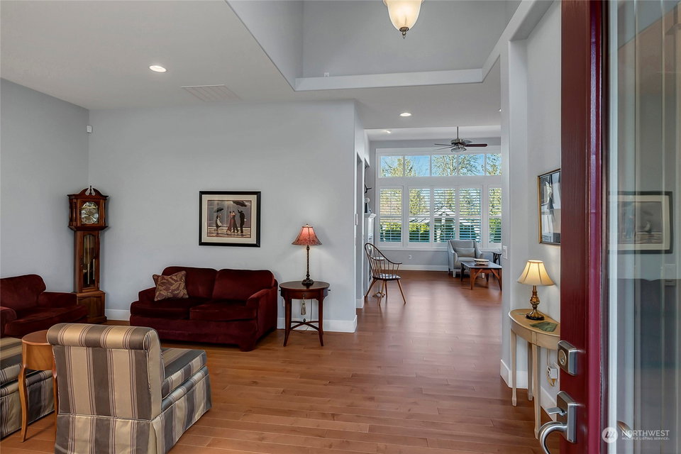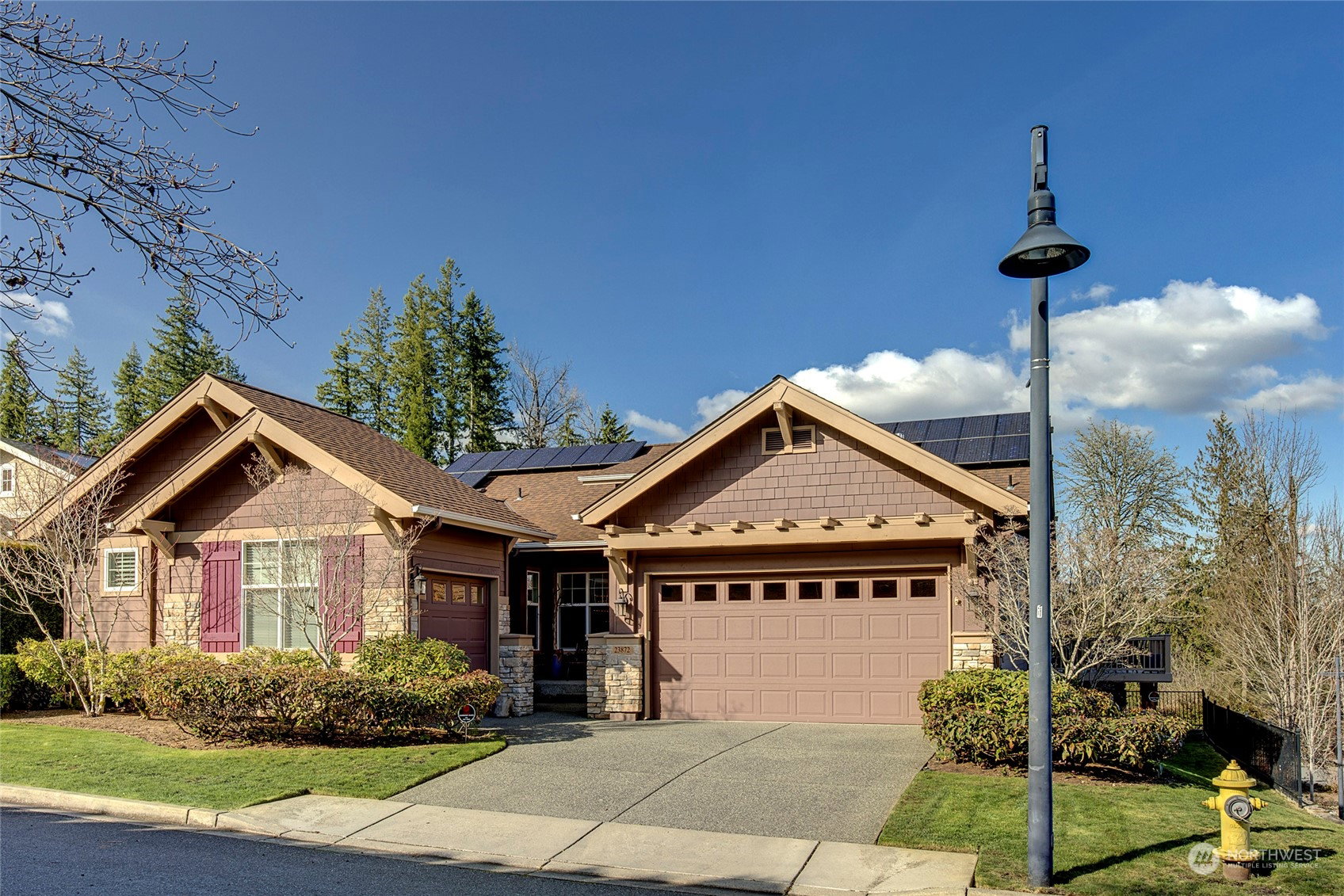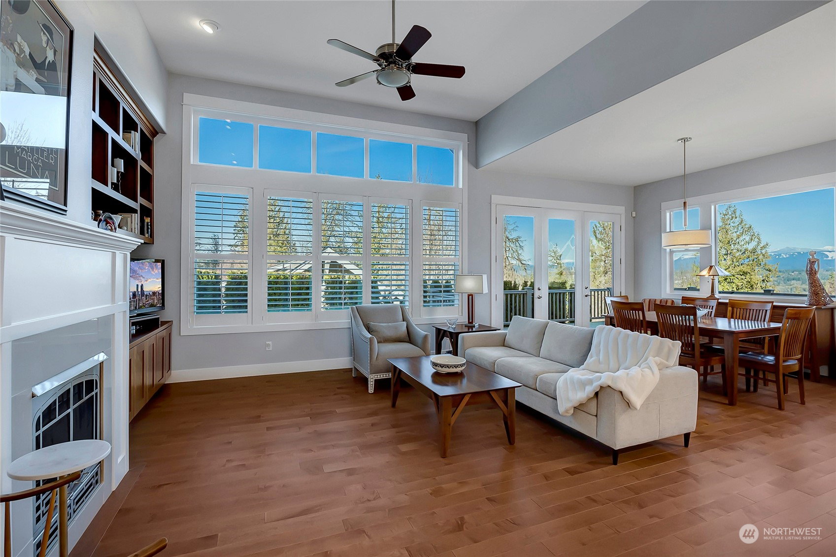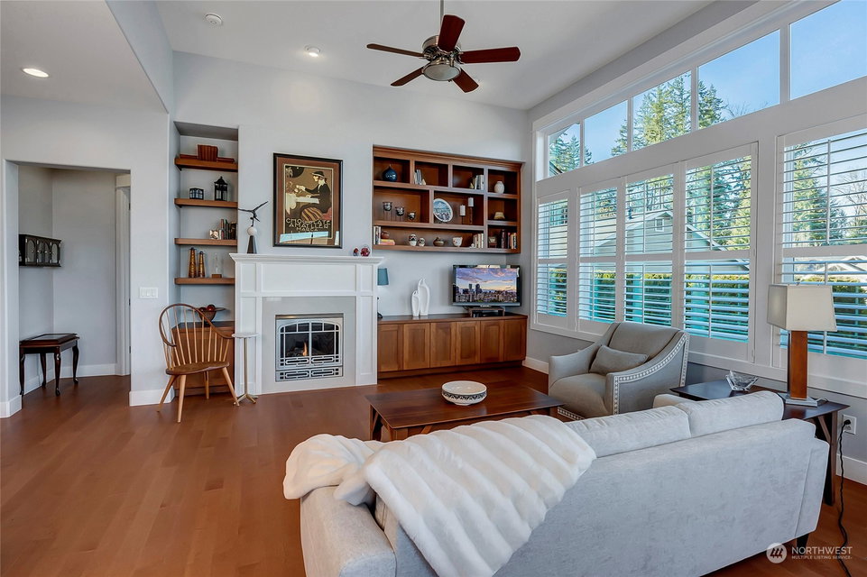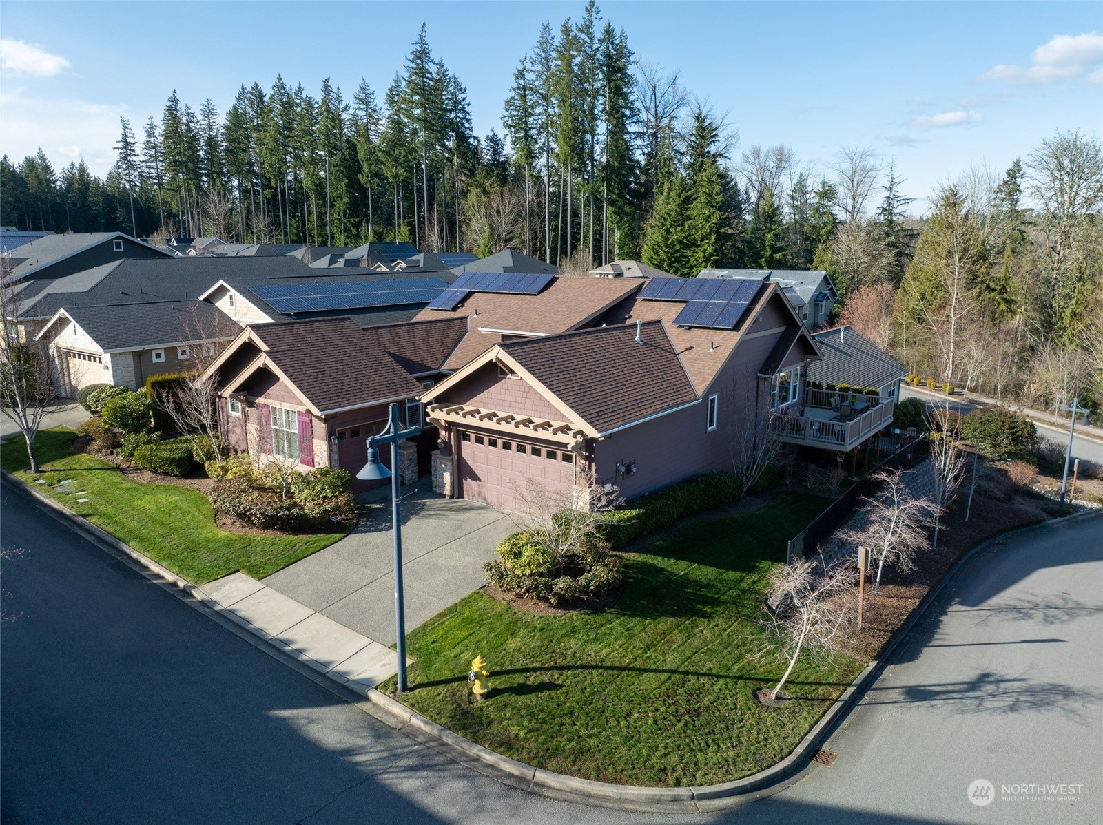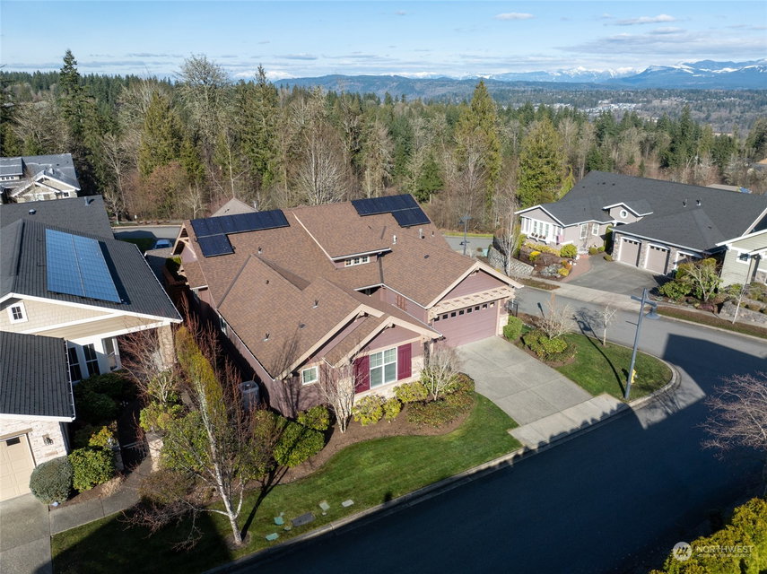 Enjoy huge mountain views from this contemporary Hemlock plan home that stands above the others with so many updates and features! Incredibly light & bright great room w/new solid Maple hardwoods, custom fireplace & built-ins, wood cabs, new quartz counters & plantation shutters. Picture window added to great room for views. Office w/tasteful built-ins. Primary suite w/2 walk-in closets & a truly custom step-in tiled shower. Spacious 2nd primary suite w/a tiled bath. Fabulous guest bath. Freshly painted interiors. Newer composite deck to take in the views & a secret garden full of blooming perennials. Roof & siding replaced 2018. Central vac, A/C & owned solar panels. Ages 55+ (53+ w/HOA approval) no one under 18. Pre-inspected.