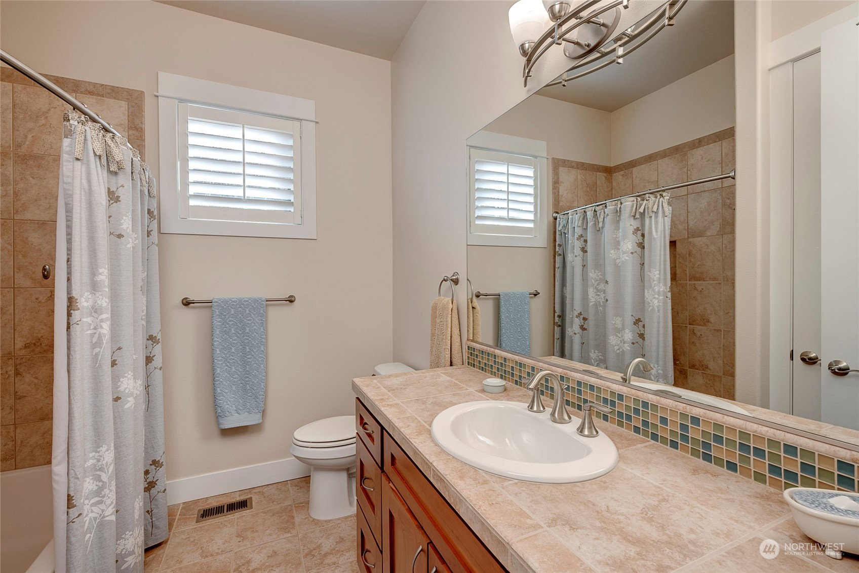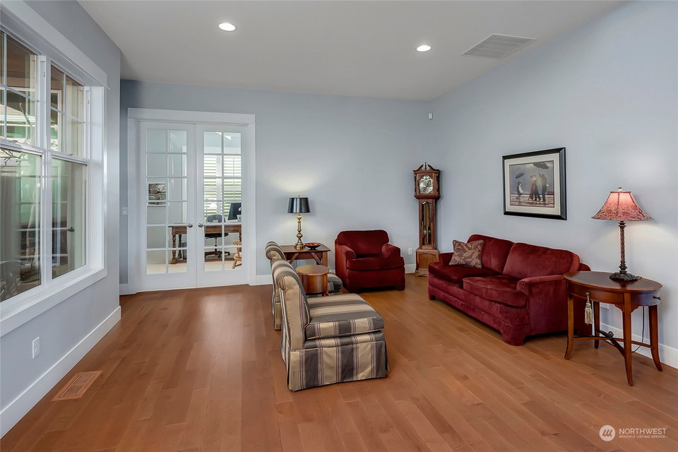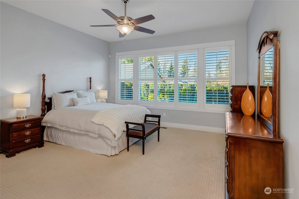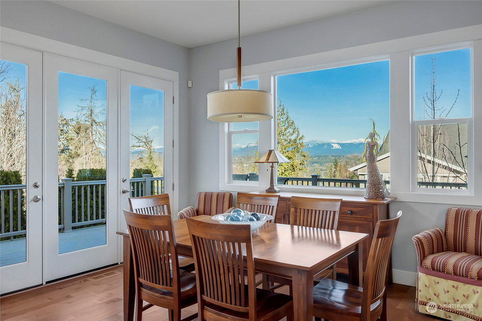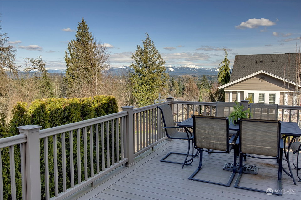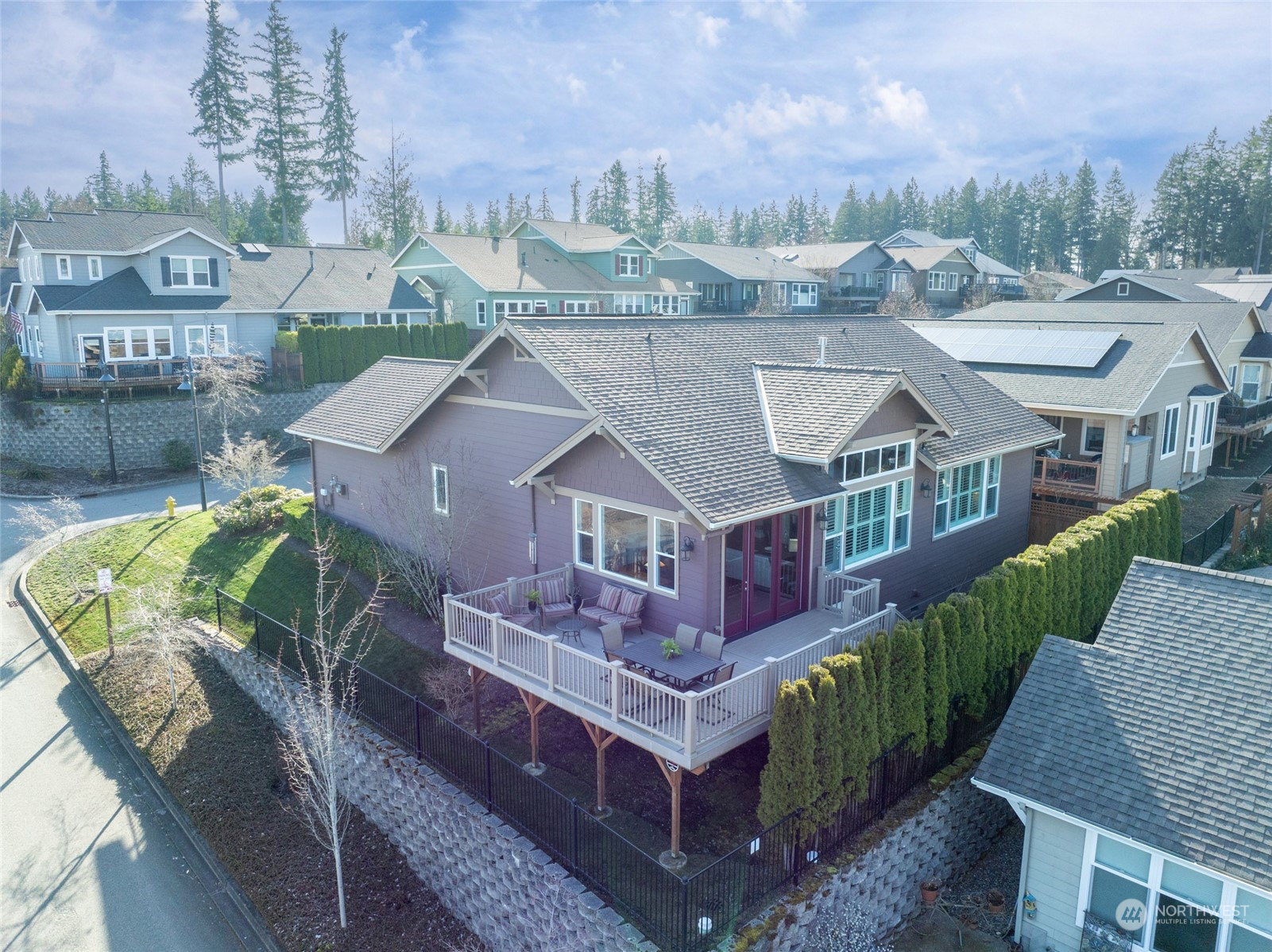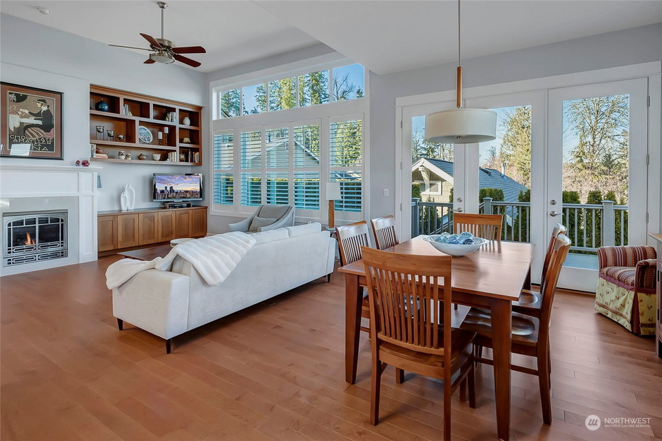 Enjoy huge mountain views from this contemporary Hemlock plan home that stands above the others with so many updates and features! Incredibly light & bright great room w/new solid Maple hardwoods, custom fireplace & built-ins, wood cabs, new quartz counters & plantation shutters. Picture window added to great room for views. Office w/tasteful built-ins. Primary suite w/2 walk-in closets & a truly custom step-in tiled shower. Spacious 2nd primary suite w/a tiled bath. Fabulous guest bath. Freshly painted interiors. Newer composite deck to take in the views & a secret garden full of blooming perennials. Roof & siding replaced 2018. Central vac, A/C & owned solar panels. Ages 55+ (53+ w/HOA approval) no one under 18. Pre-inspected.