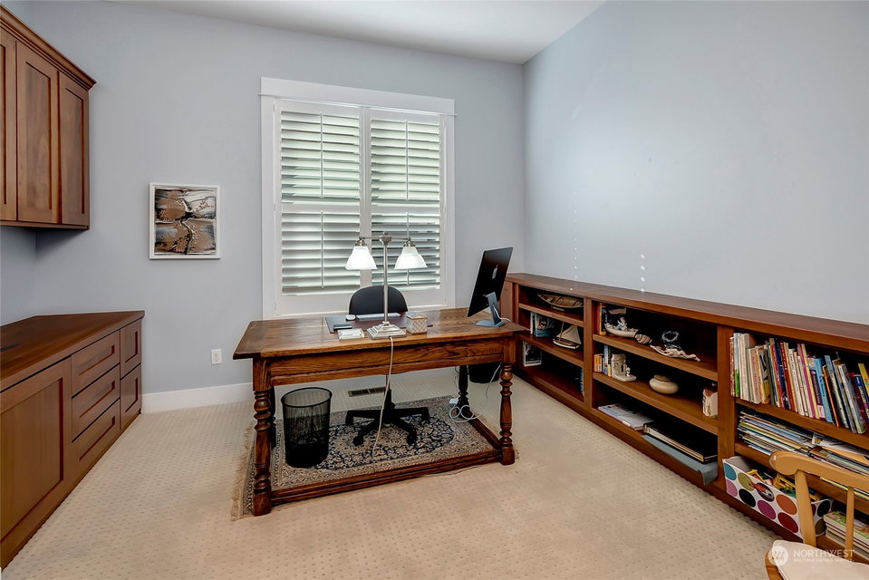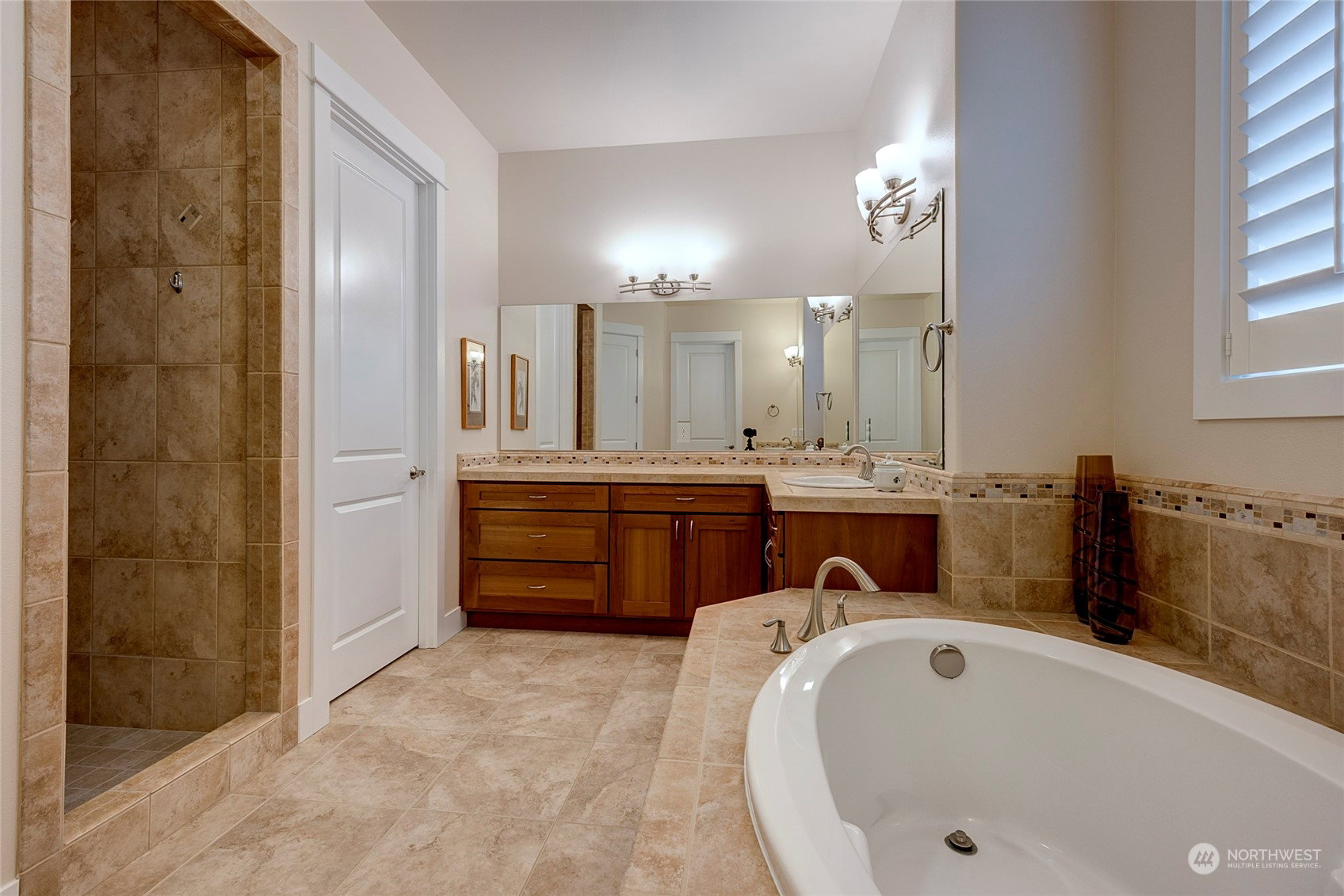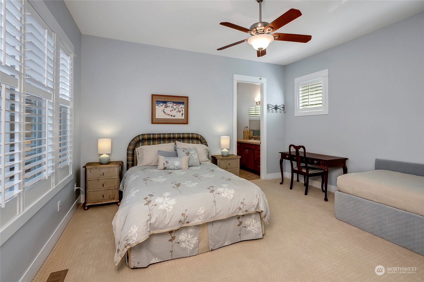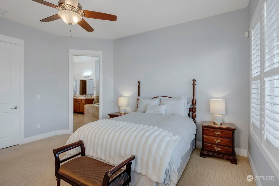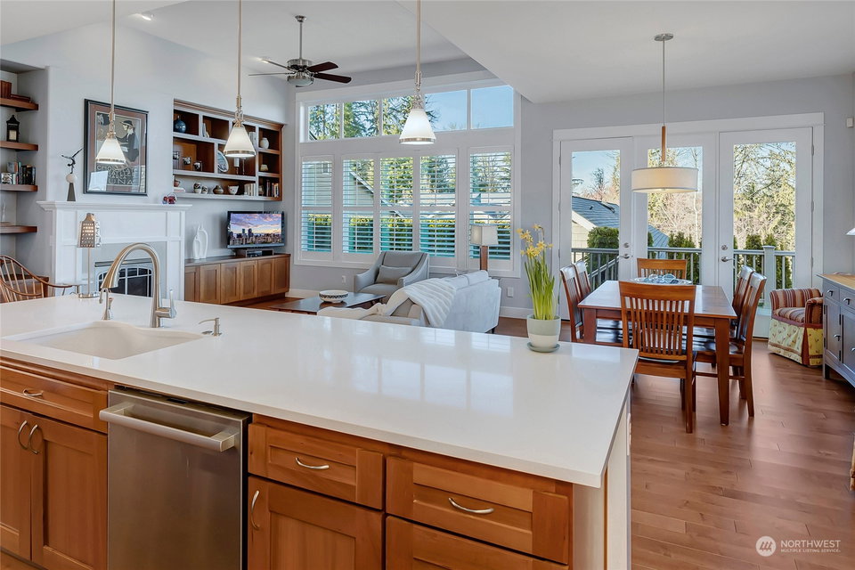 Enjoy huge mountain views from this contemporary Hemlock plan home that stands above the others with so many updates and features! Incredibly light & bright great room w/new solid Maple hardwoods, custom fireplace & built-ins, wood cabs, new quartz counters & plantation shutters. Picture window added to great room for views. Office w/tasteful built-ins. Primary suite w/2 walk-in closets & a truly custom step-in tiled shower. Spacious 2nd primary suite w/a tiled bath. Fabulous guest bath. Freshly painted interiors. Newer composite deck to take in the views & a secret garden full of blooming perennials. Roof & siding replaced 2018. Central vac, A/C & owned solar panels. Ages 55+ (53+ w/HOA approval) no one under 18. Pre-inspected.