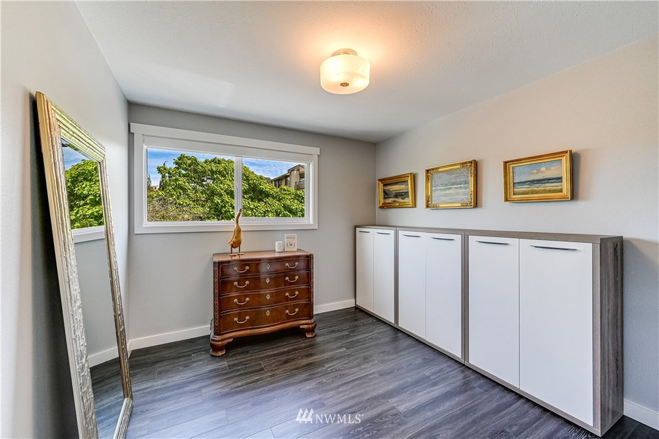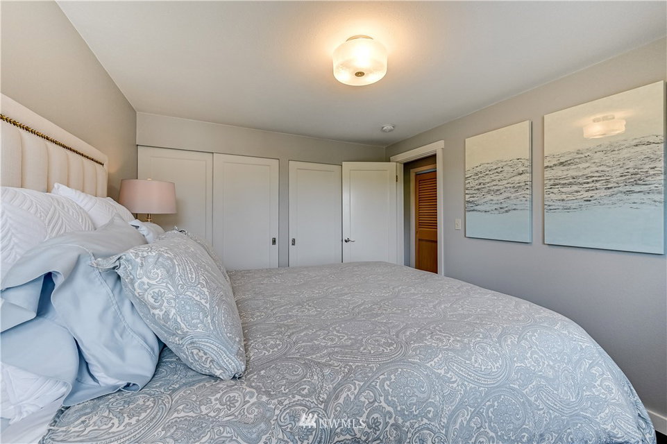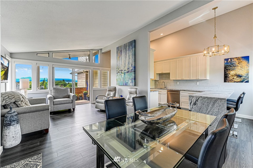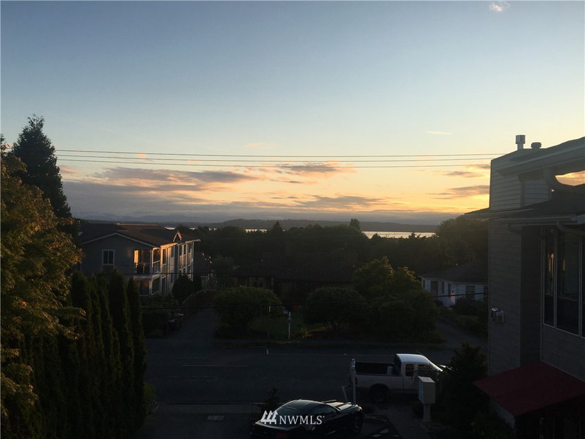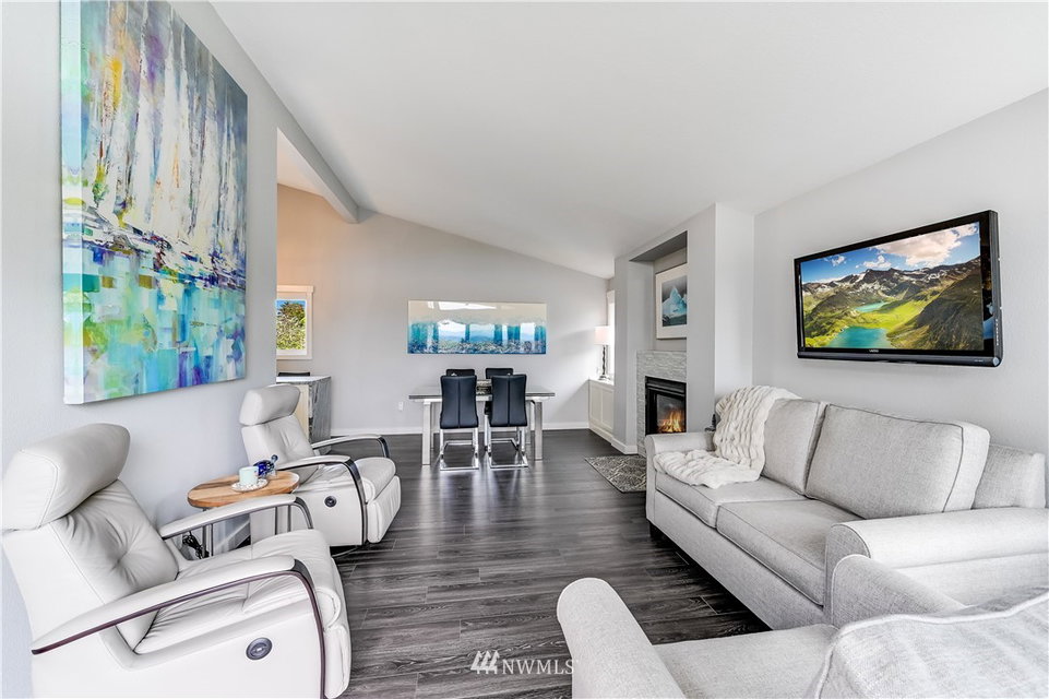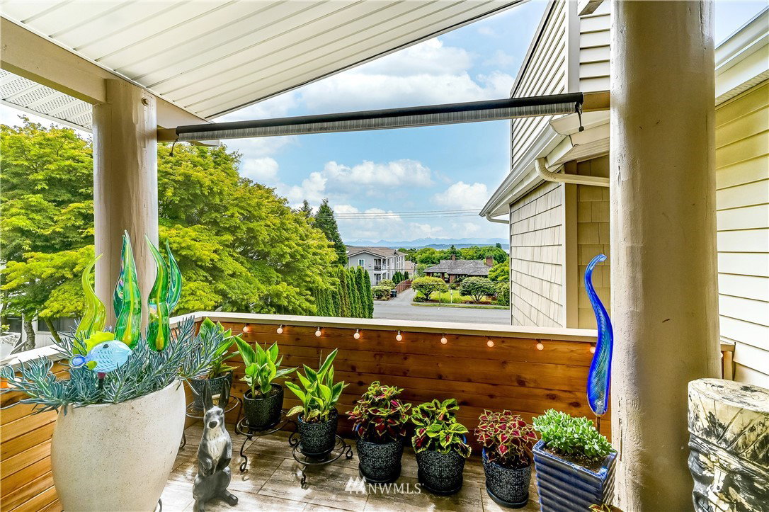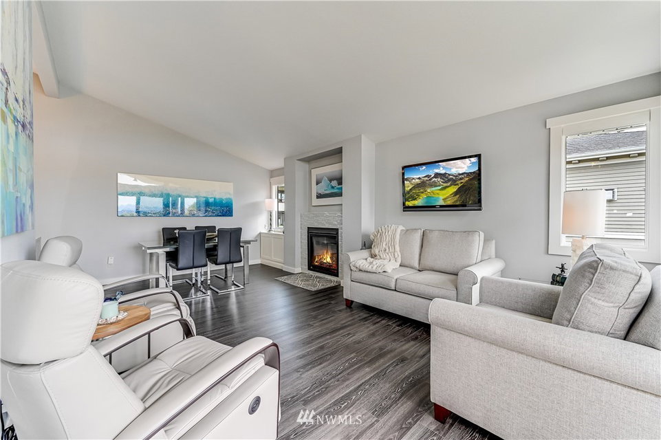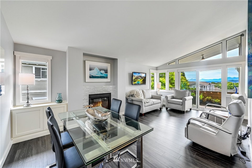 City Chic view condo in downtown Edmonds, just two level blocks to Main St. Full remodel in 2019 with designer fixtures, finishes & blinds thruout. True custom cabinetry, leathered slab w/waterfall edge & glass tile backsplash, beautiful entry cabinetry, vaulted ceilings, all new bath, LVP floor thruout, new gas fireplace w/glass tile surround, new LED lights, new elec panel & hot water tank. 2 parking spaces & 2 oversized storage areas. Just 1.5 levels to this top floor unit. Rentals & pets ok